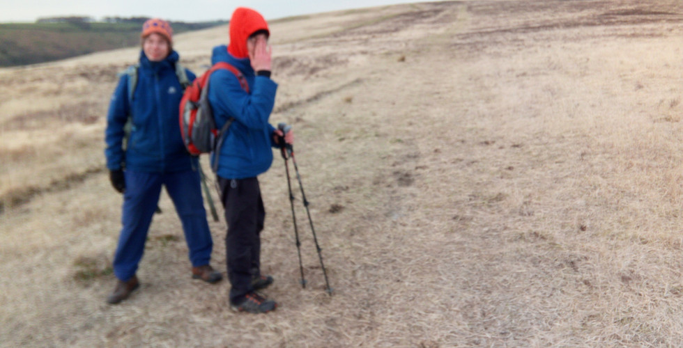 After wandering up Dr Blackalls Drive (a lane the doctor had built in aid of his ailing wife) we trudged up onto Hameldown ascending to 500metres. As we travelled on up, the wind met us in the face and I was glad to accept the offer of a shiny windproof soft shell jacket. I met lots of large groups walking their dogs the other way who seemed delighted to have had their backs facing leeward. After passing a 45m Ten Tors team I was soon to rondevous back with Dad at Bennet's Cross, stopping for another cup of tea, followed by a bread role and a chance to salve the backs of my heals.